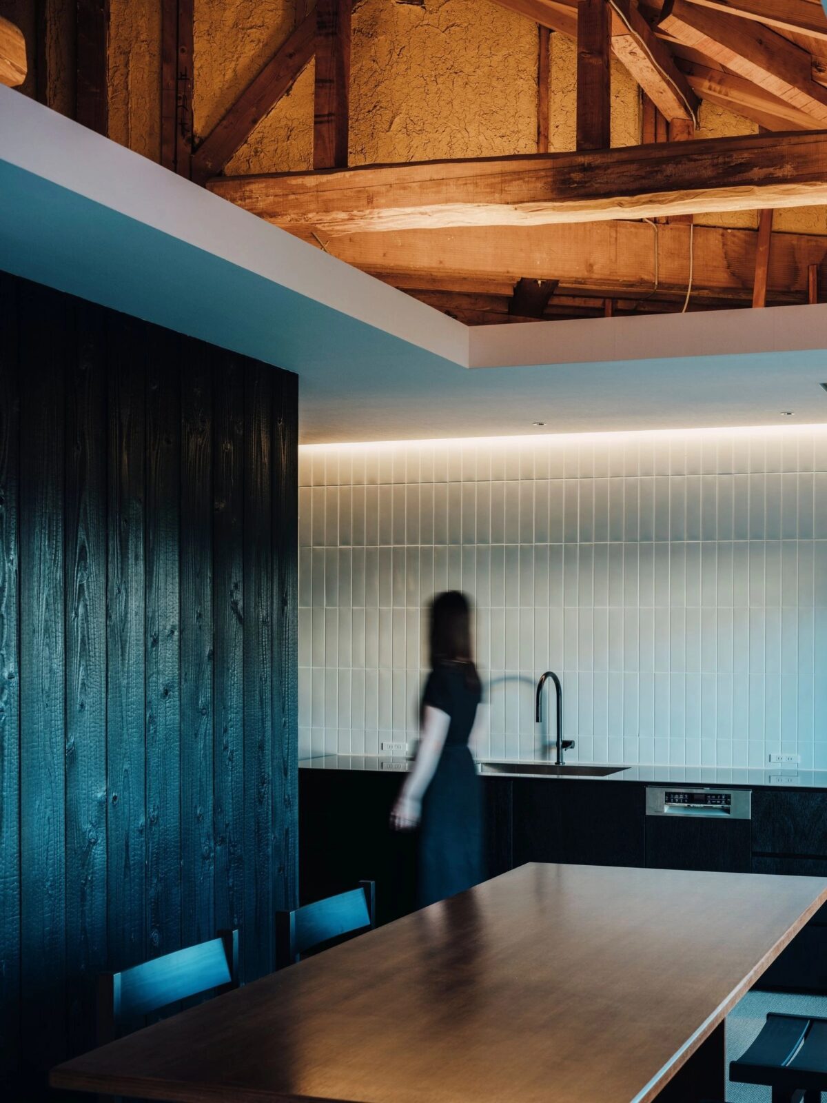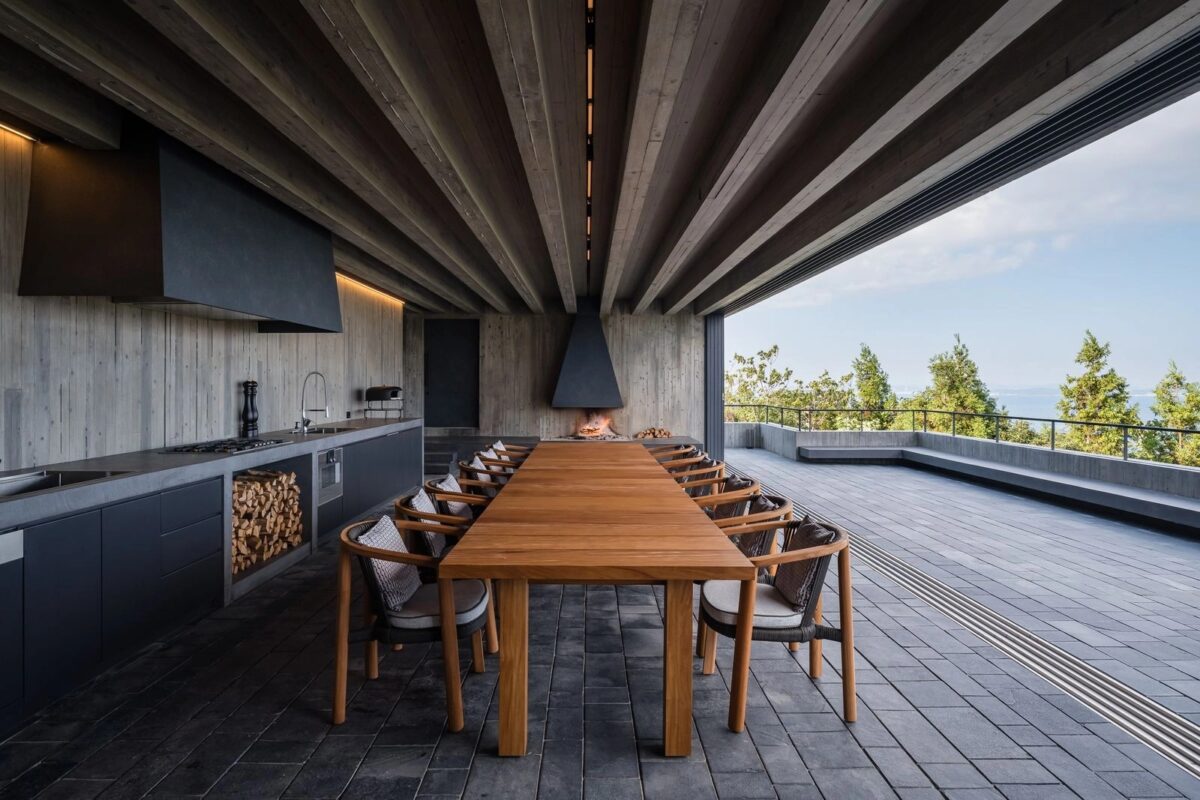 山頂に位置し、海・山・空に360°囲まれた敷地に建つ別荘兼宿泊施設です。くびれた地形に対して2棟を配置し、グランドレベルと2階レベルをコリドーで接続することで、回遊性のある構成としています。勾配屋根により視線を外へと導き、風景を切り取るように取り込みます。さらに石切場の記憶に着想を得た素材や、炎・水・植栽などの要素を重ねることで、五感に働きかける滞在環境を実現しています。