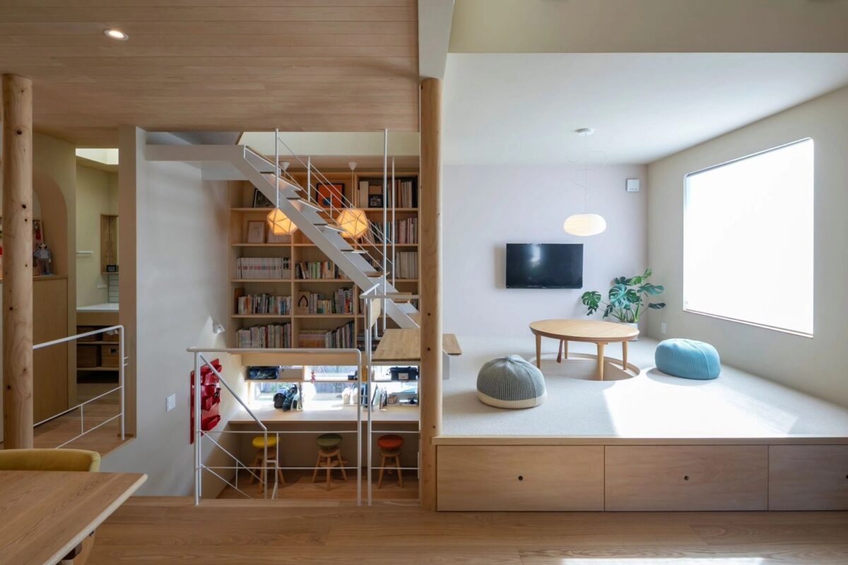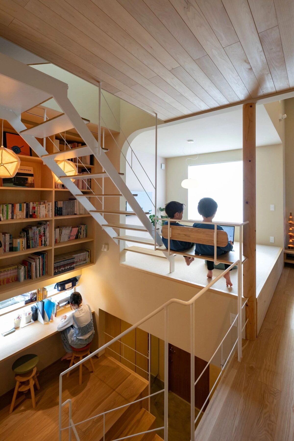 住宅密集地に建つ住宅です。家の各所にベンチや踊り場、コーナーなどの居場所を点在させ、それらを緩やかにつなぐことで、距離を保ちながらも家族の気配や視線が行き交います。人だけではなく光や風もその間を通り抜け、内外の環境と呼応しながら、日常の中に多様な居場所が重なり合う住空間となっています。
