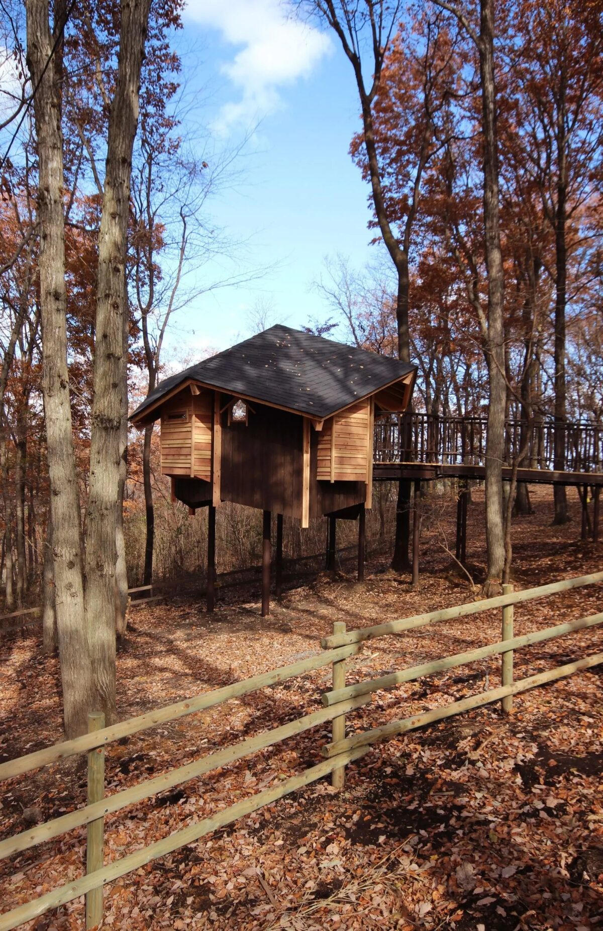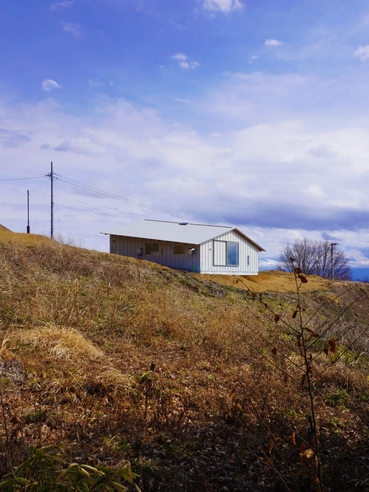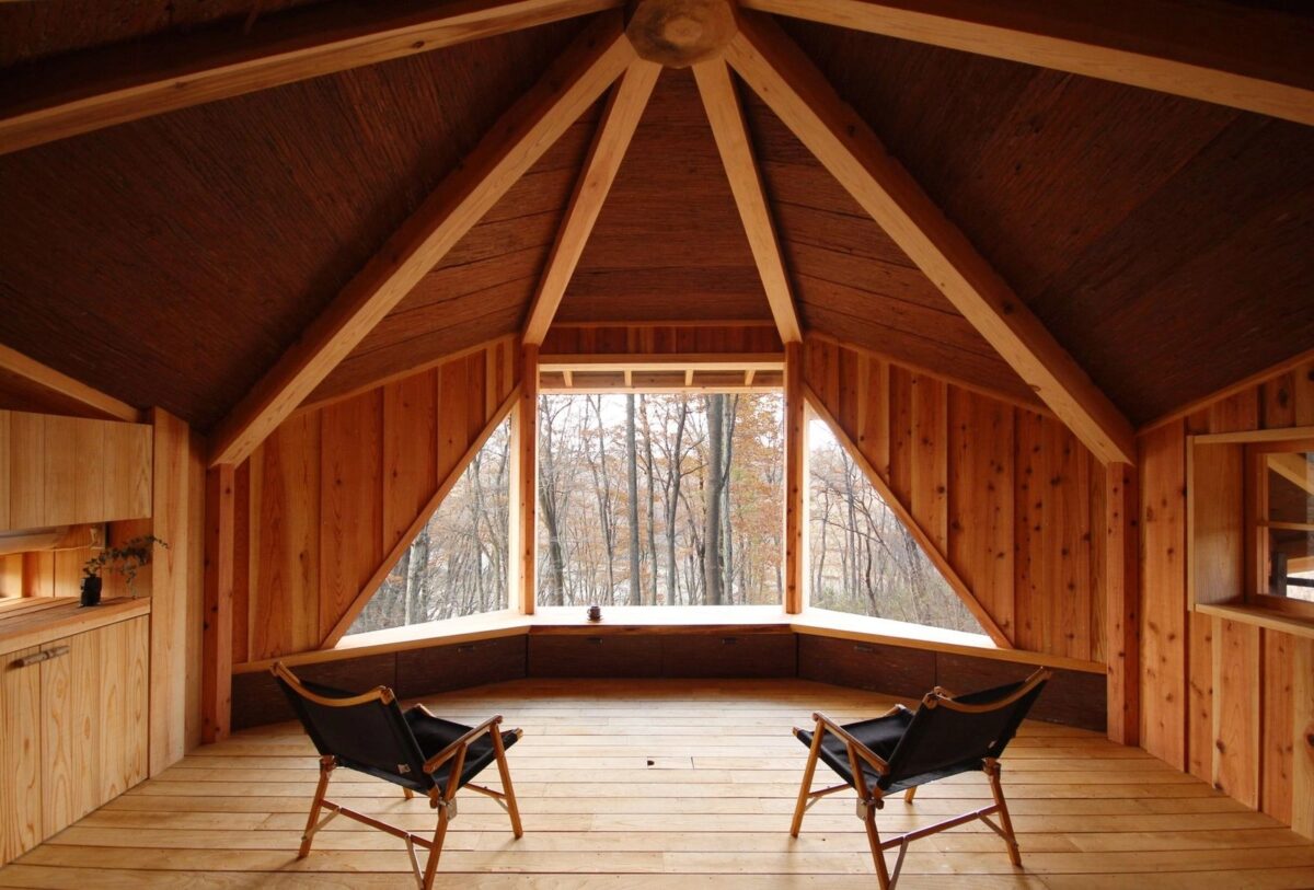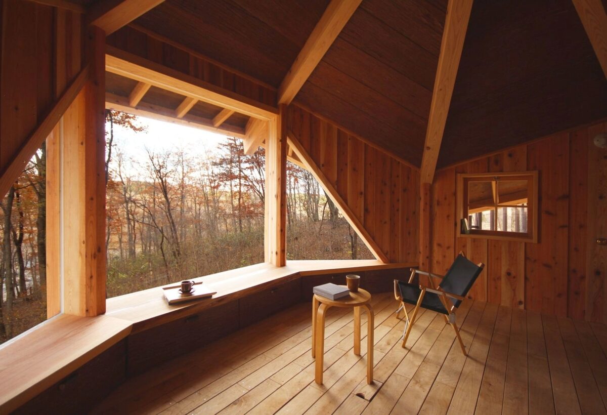 那須町の木立の中に建つ小さな木造建築で、自然に没頭するための場として計画されました。八角形の平面にさまざまな勾配の登梁を架け、それらを蕪束で受けることで、森の中に浮遊するような軽やかな架構を形づくっています。躙口のように高さを抑えた入口から内部へ入ると、視線が上方へと抜け、空と森へと連続する体験を生み出しています。
