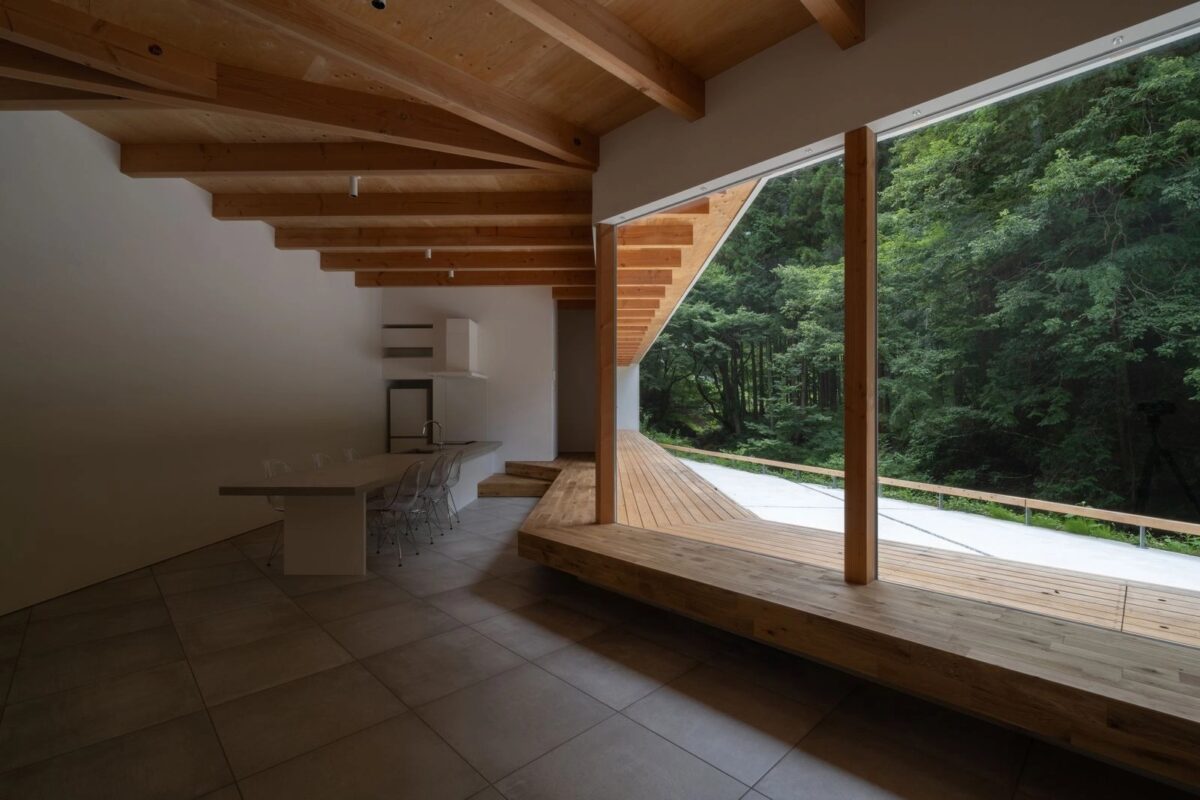 奥多摩の緑に囲まれ、道路と川に挟まれた敷地に建つ別荘です。地形や周囲の環境に呼応するように建物を折り曲げ、庭と川に向かって開くように構えます。道路側では外部からの視線や環境を制御しつつ、庭・川側には深い軒と連続するテラスを設け、光や風、緑を室内へと導きます。さらに外部デッキと連続するベンチを配し内外一体の空間としています。