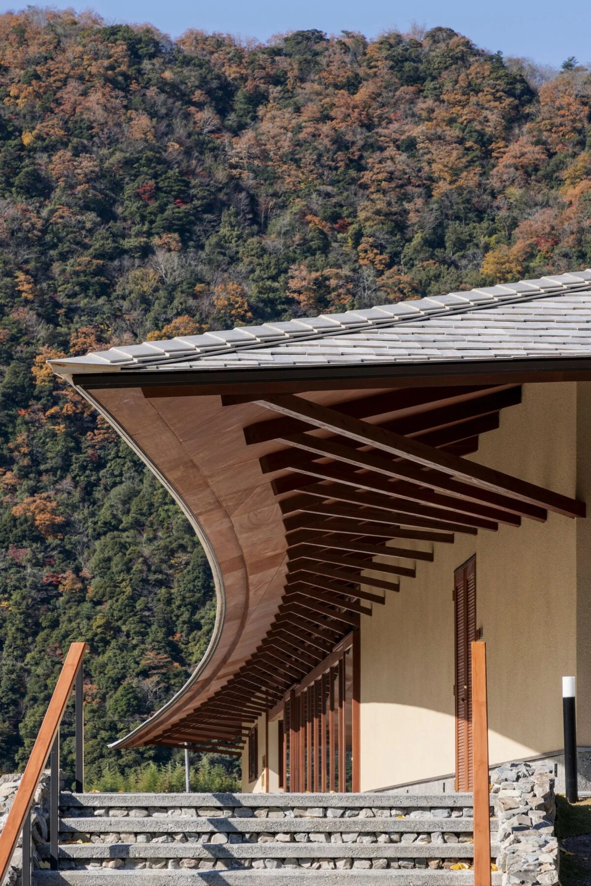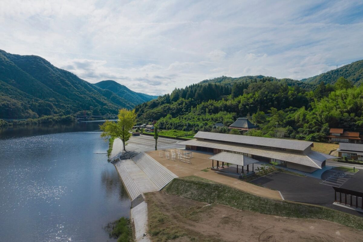 雄大な自然のなか、川沿いに建つカヌー競技施設です。地域のカヌー文化とバリ島との交流を背景に、バリの生活哲学や建築様式が参照されました。川や山並みに呼応する弧を描く大屋根は、伝統的なカヌー「ジュクン」をモチーフとし、周囲の自然と連続する空間を形成しています。競技施設としての機能に加え、祭事やイベントの場としても活用され、文化交流と賑わいを生み出す拠点となっています。