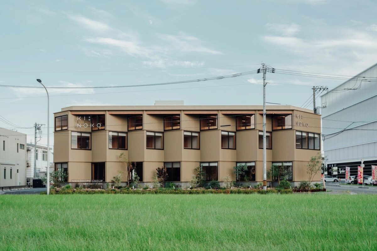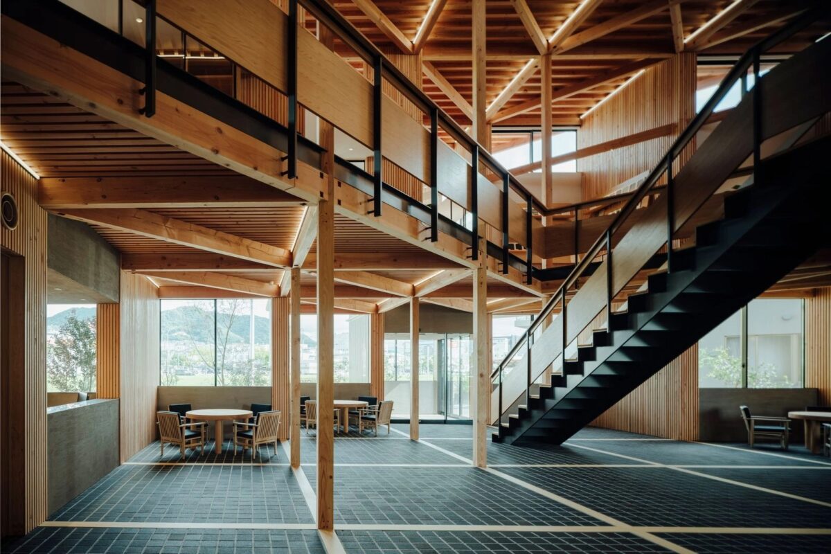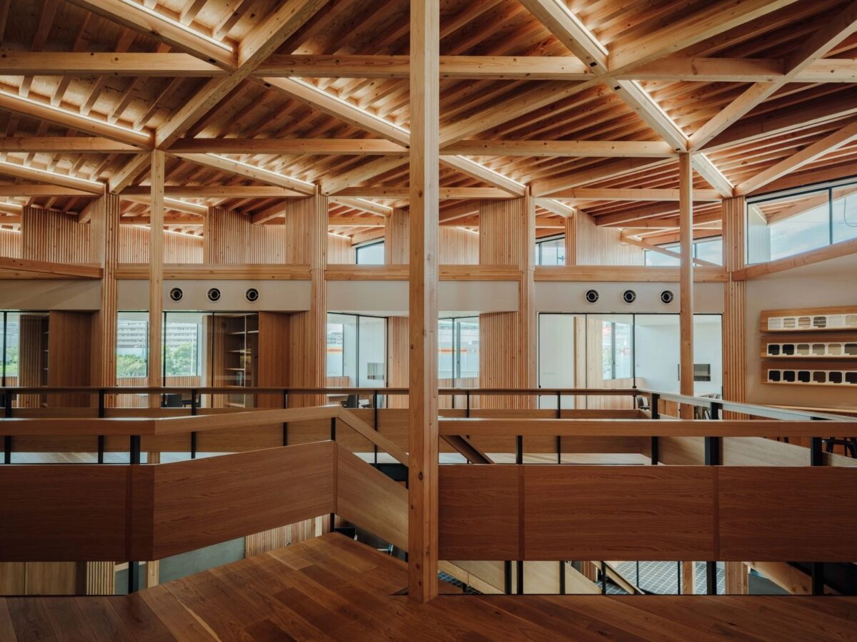 住宅のない周辺環境に対し、木造モジュールを基準としたスケールや寸法を取り入れ、「家」の感覚を持ち込むことが目指されたオフィス。グリッドを45°振って外形を雁行させ、植栽を介して外部環境に柔らかな余白を生み出すとともに、内部では吹き抜けを中心とした回遊動線を取り入れています。木架構や格子を現しとし、光や素材の質感を活かすことで、居心地のよい場を形成しています。
