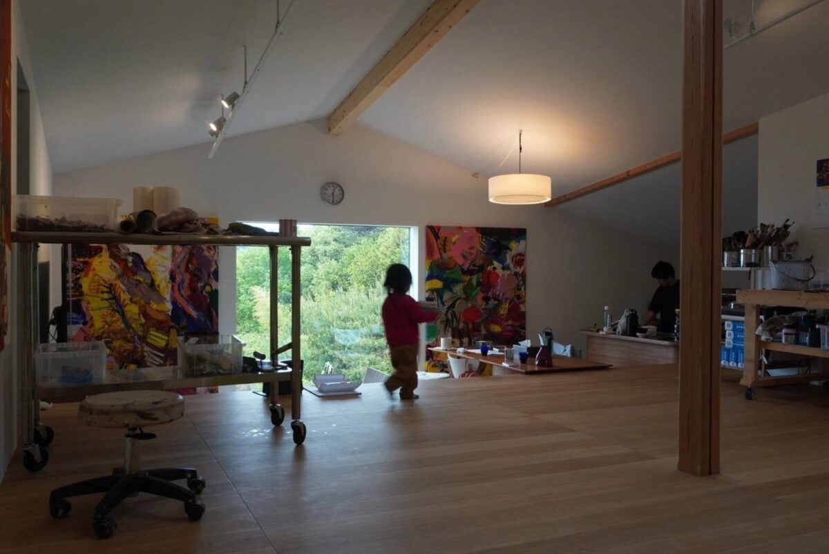 山から市街地へと連なる傾斜地の中腹に建つ、画家のアトリエを併設した住宅です。敷地の勾配に呼応して基礎や屋根を斜めに構成し、地形に沿う段状の空間を計画しています。中央のアトリエを核に各室を配置し、床や屋根の流れに沿って視線が外部の風景へと導かれる構成としています。形のリズムと呼応しながら、家族の暮らしと環境が緩やかに結びつく住空間を実現しています。
