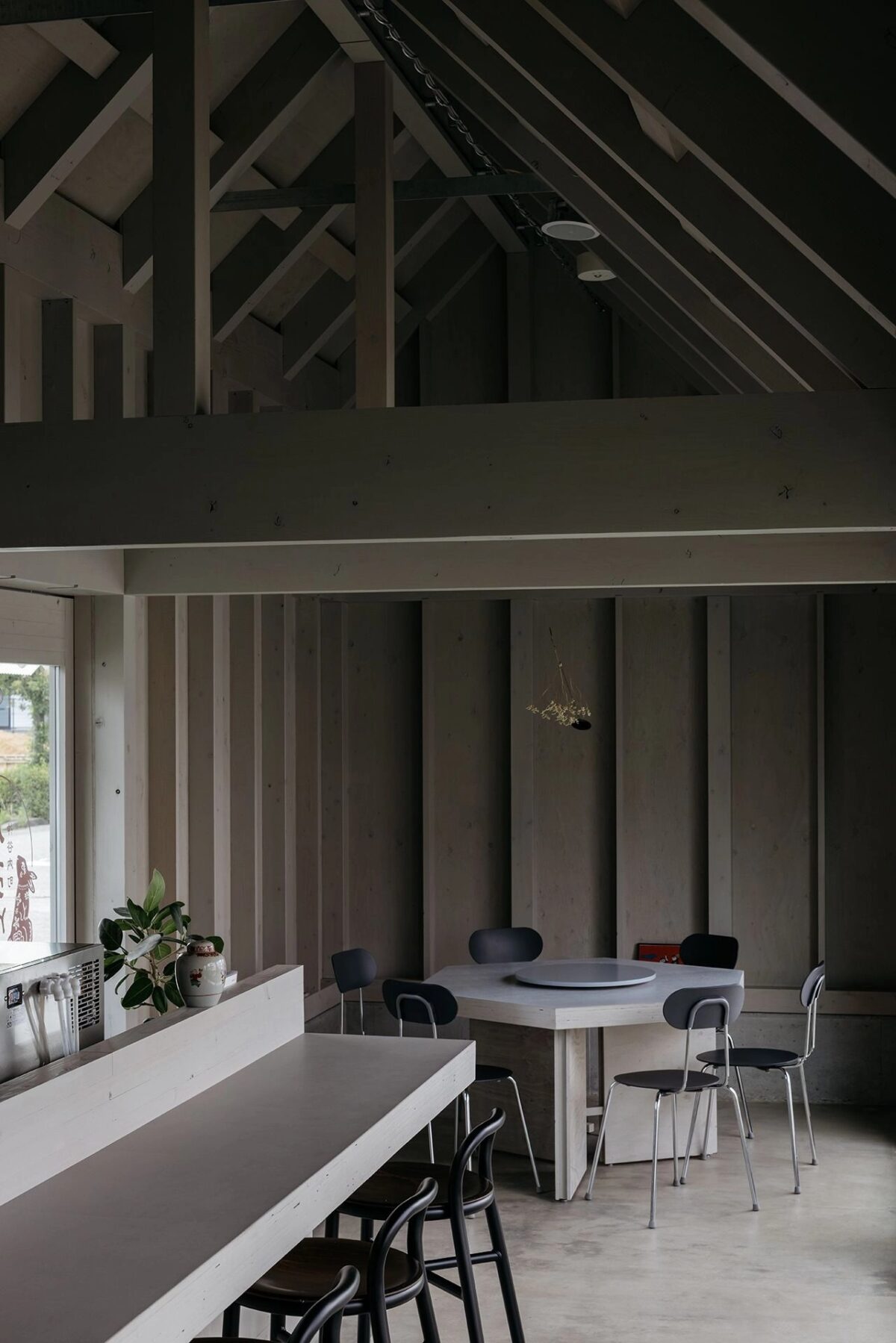 住宅地に建つ町中華店です。かつて蓮根畑であった敷地に対し、過度に主張しない佇まいとすることで、街並みに静かに据えられるように計画しています。落ち着いたスケールや素材、照明計画を丁寧に整え、店主や来訪者にとって居心地のよい滞在時間を支えています。地域の日常に溶け込みながら、人々が気軽に立ち寄れる場となっています。