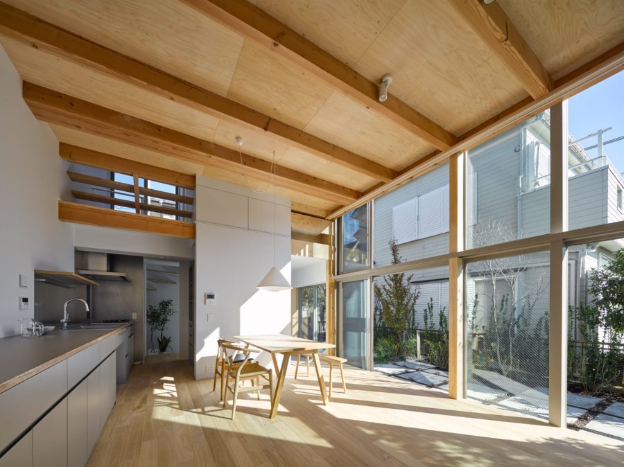 太陽や海、山。大屋根の下は、どこからでも外を感じる開放的な空間。角が開く特殊な大開口サッシを開けると、室内にいることを忘れてしまうほどだ。