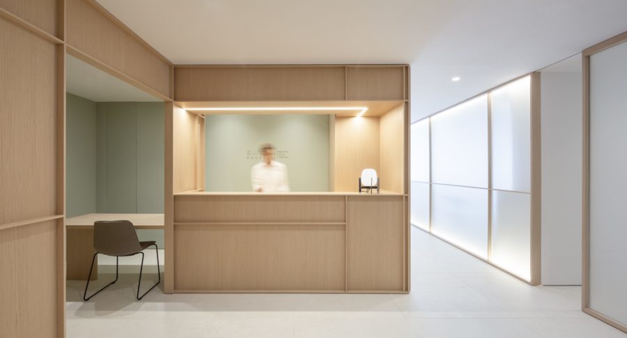ラワン幅木壁と造作を巡らせた予防医療クリニック