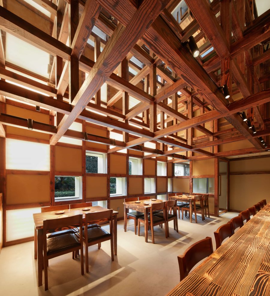 連続性を持たせた木組みで時間の超越性を表現した日本料理店