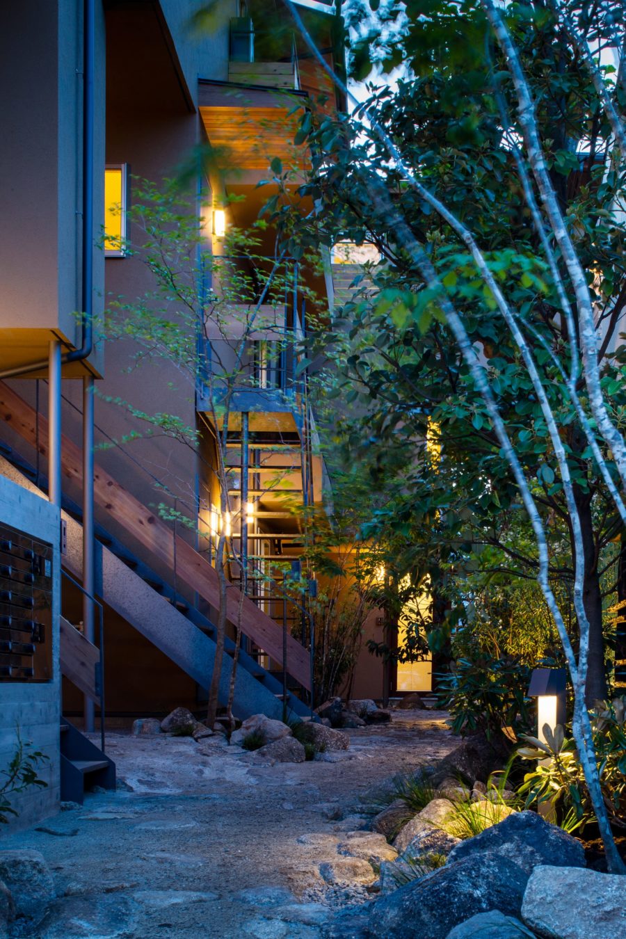 庭と建物をクロスする通路が熟成を重ねていく共同住宅